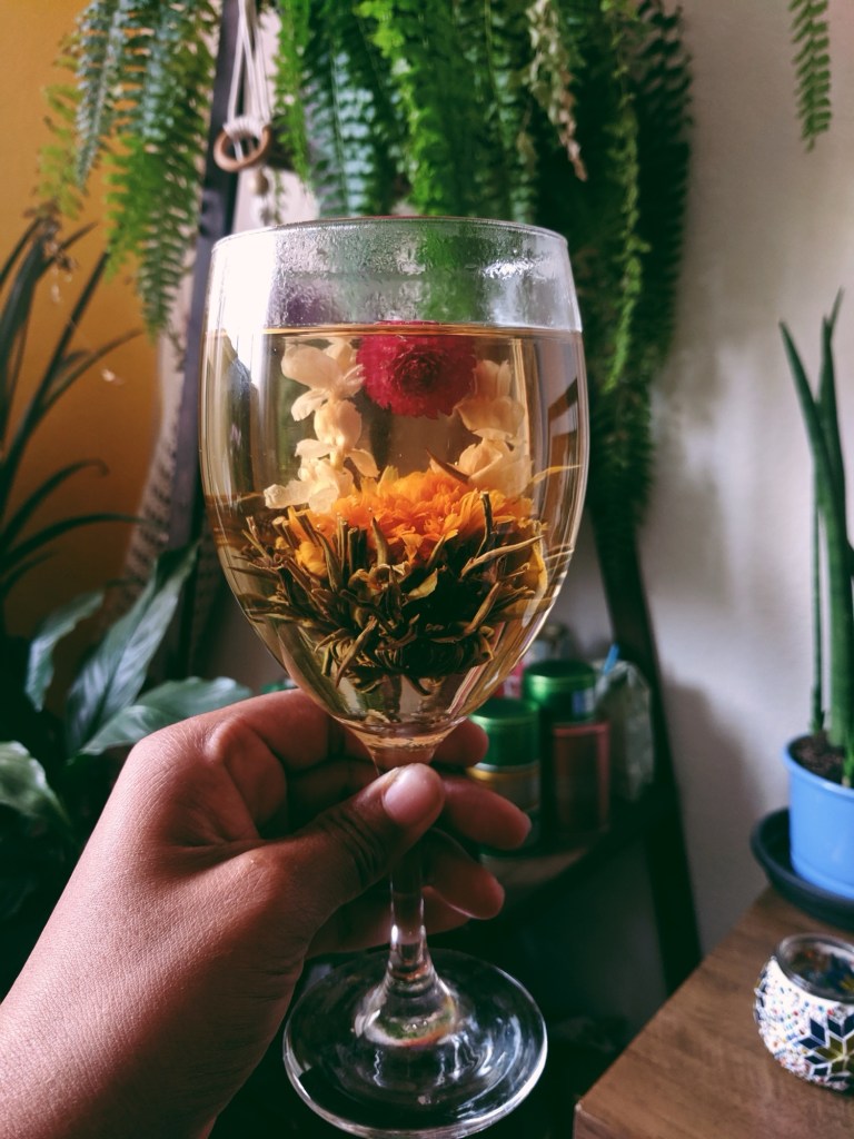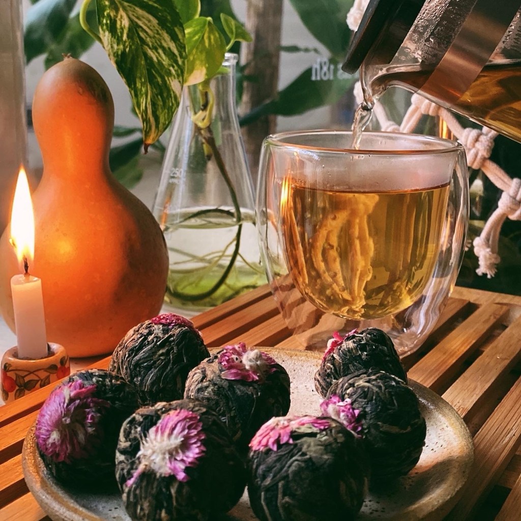 A blooming tea é uma criação artesanal nascida na China. Normalmente feita a partir de chá branco ou chá verde de altíssima qualidade, ela é cuidadosamente amarrada junto a pétalas de flores comestíveis, como crisântemos, jasmim, hibisco ou lírios. Cada bulbo é montado manualmente, como se fosse uma pequena escultura vegetal.